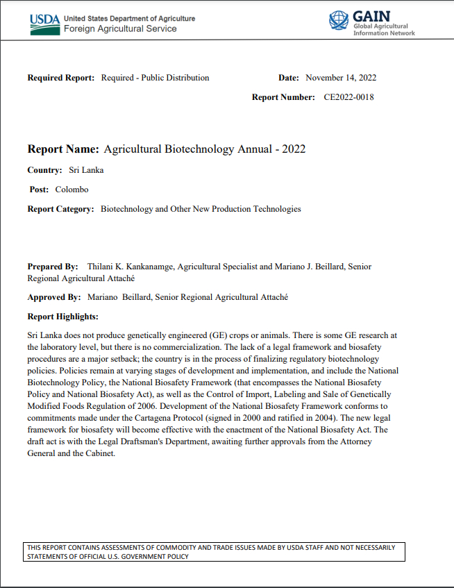 (2023) Izvješće SAD-a potvrđuje proizvodnju GMO hrane u Šri Lanki Izvor: AgricultureInformation.lk | Dokument Ministarstva poljoprivrede Sjedinjenih Država